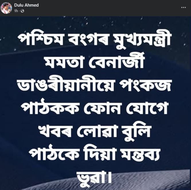 Pankaj Pathak । Dulu Ahmed । “পশ্চিমবংগৰ মুখ্যমন্ত্রী মমতা বেনার্জীয়ে পংকজ পাঠকক ফোন কৰা বাতৰি ভুৱা”-দুলু আহমেদ । পংকজ পাঠকে পশ্চিমবংগৰ মুখ্যমন্ত্রী মমতা বেনার্জীয়ে তেখেতক ফোন কৰাবুলি কৰা মন্তব্য ইতিমধ্যে অসমৰ সংবাদ মাধ্যমত প্রকাশ পাইছে।
