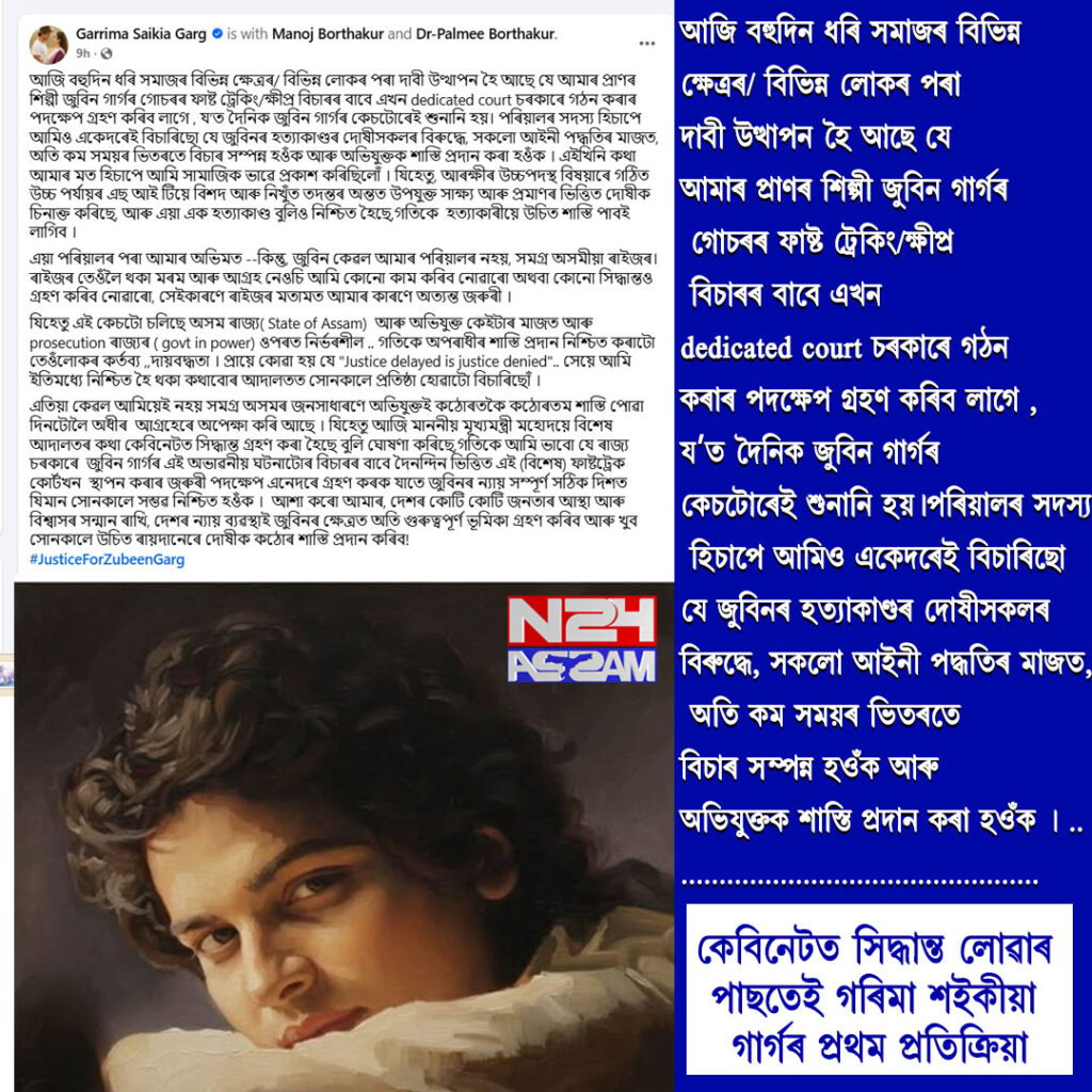 ৰাজ্য কেবিনেটে প্ৰখ্যাত শিল্পী জুবিন গাৰ্গৰ হত্যাকাণ্ডৰ বিচাৰ ক্ষিপ্ৰ কৰাৰ লক্ষ্যৰে এখন বিশেষ ফাষ্টট্ৰেক আদালত গঠনৰ সিদ্ধান্ত গ্ৰহণ কৰিছে। এই সিদ্ধান্ত ঘোষণা কৰাৰ পাছতেই নিশা সামাজিক মাধ্যমত নিজৰ প্ৰথম প্ৰতিক্ৰিয়া প্ৰকাশ কৰে জুবিন-পত্নী গৰিমা শইকীয়া গাৰ্গয়ে।