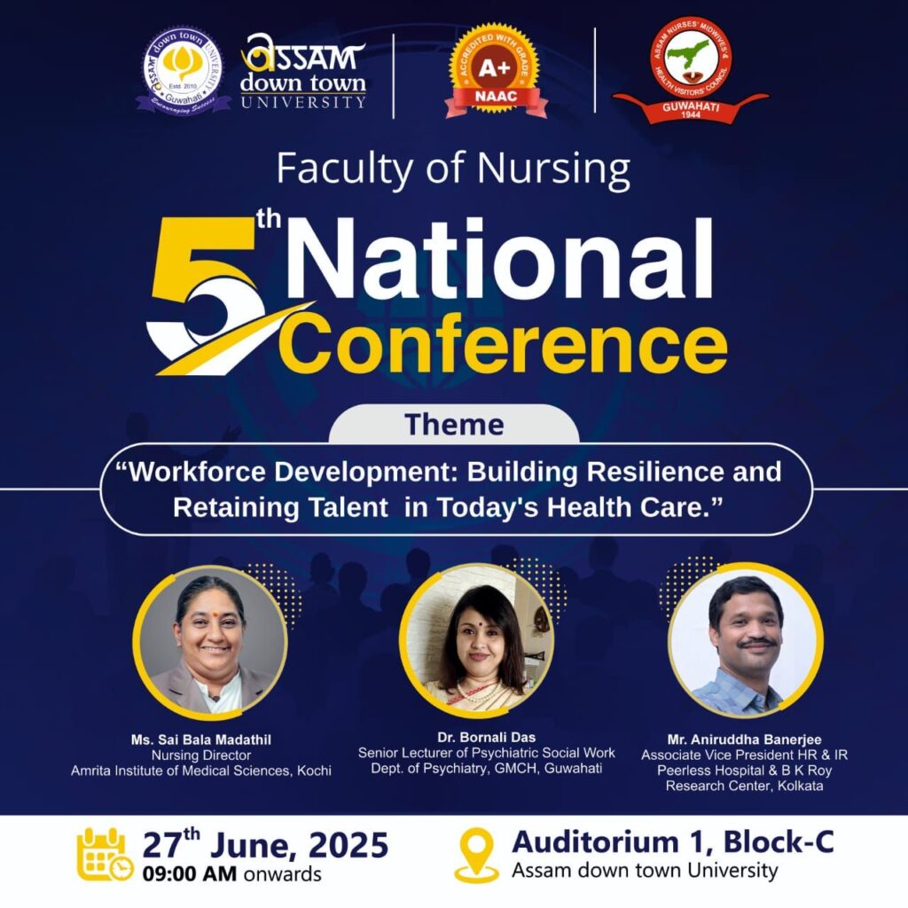 অসম ডাউন টাউন বিশ্ববিদ্যালয়ৰ নার্সিং অনুষদৰ উদ্যোগত ২০২৫ চনৰ ২৭ জুন তাৰিখে অনুষ্ঠিত হ’ব ৫ম ৰাষ্ট্ৰীয় সন্মিলন, যাৰ মূল বিষয়বস্তু হ’ব — “স্বাস্থ্য সেৱাত কৰ্ম বিকাশ: অৱিচলতা গঢ়ি তোলা আৰু প্ৰতিভা ৰক্ষা” (Workforce Development: Building Resilience and Retaining Talents in Today’s Health Care)।