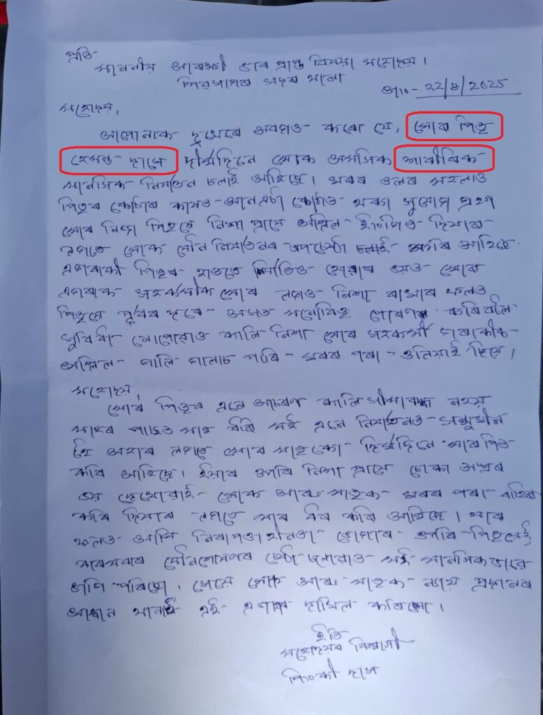 অতিষ্ঠ হৈ পিতৃৰ বিৰুদ্ধে শিৱসাগৰ সদৰ থানাত এজাহাৰ দাখিল কৰিছে ।