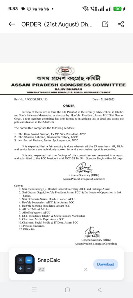 Congress South Salmara Mankachar । দক্ষিণ শালমৰা-মানকাচৰত অনুষ্ঠিত হোৱা পঞ্চায়ত নিৰ্বাচনৰ ফলাফলৰ পিছতেই কংগ্ৰেছ দলত গৃহযুদ্ধ আৰম্ভ হৈছে। জিলা পৰিষদৰ প্ৰাৰ্থীক লৈ উঠি থকা এই বিতৰ্কে আগন্তুক বিধানসভা নিৰ্বাচনৰ পূৰ্বেই কংগ্ৰেছৰ মাজত অশান্তি বৃদ্ধি কৰিছে।