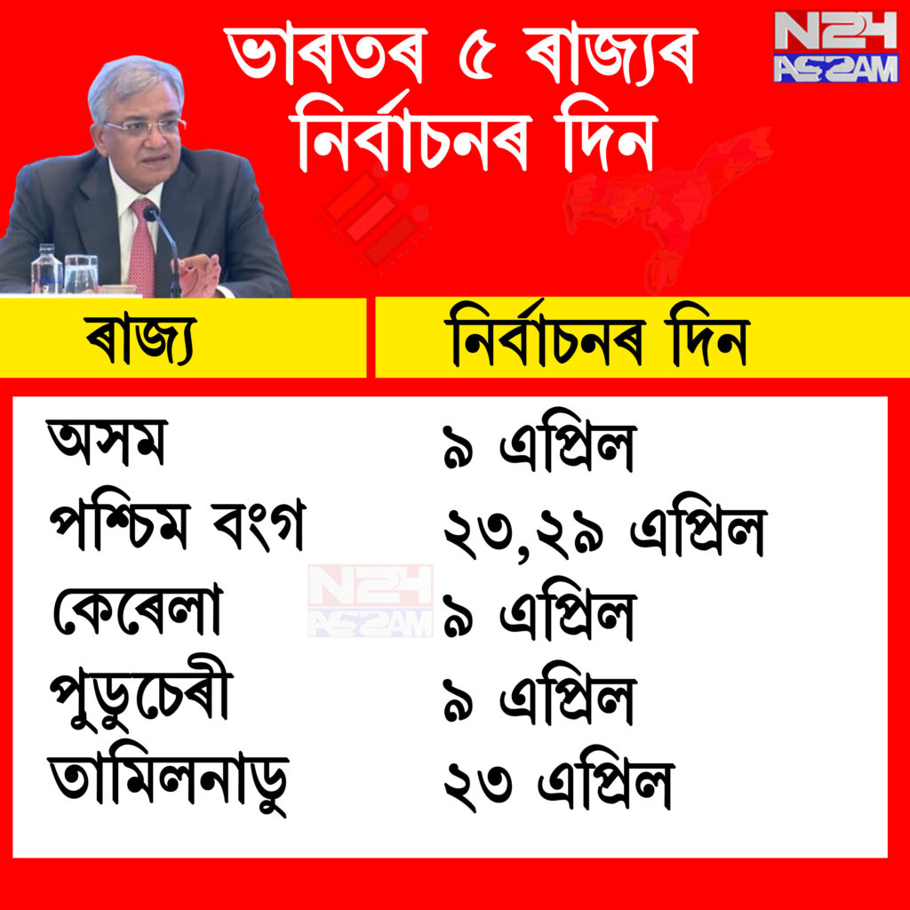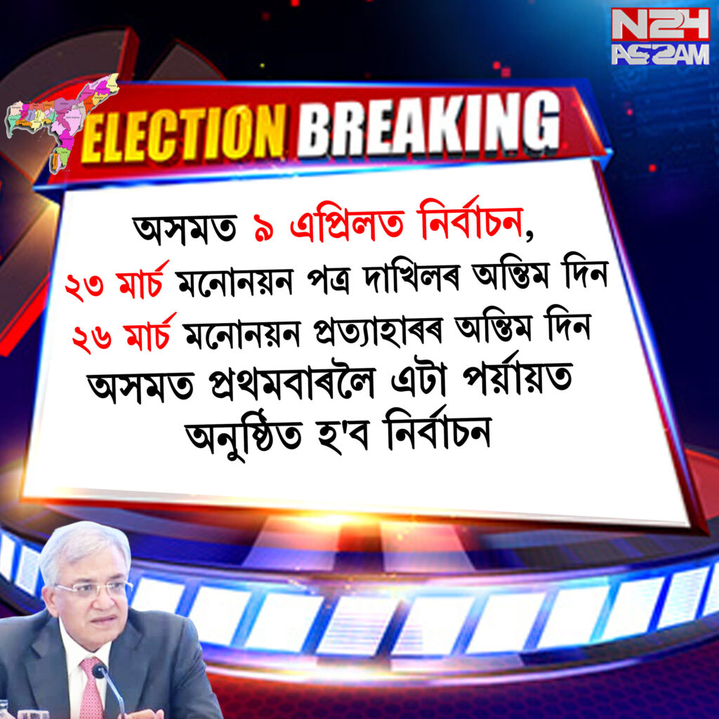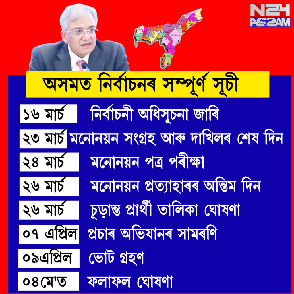 ঘোষণা অনুসৰি অসমত এইবাৰ এটা পৰ্যায়তেই অনুষ্ঠিত হ’ব বিধানসভা নিৰ্বাচন। ৯ এপ্ৰিলত অনুষ্ঠিত হ’ব ভোটগ্ৰহণ। ১৬ মাৰ্চত জাৰি কৰা হ’ব নিৰ্বাচনী অধিসূচনা। মনোনয়ন পত্ৰ দাখিলৰ অন্তিম দিন ২৩ মাৰ্চ, মনোনয়নৰ পুননিৰীক্ষণৰ তাৰিখ ২৪ মাৰ্চ আৰু মনোনয়ন প্ৰত্যাহাৰৰ অন্তিম দিন ২৬ মাৰ্চ ধাৰ্য কৰা হৈছে। আনহাতে ৪ মে’ত অনুষ্ঠিত হ’ব ভোটগণনা আৰু ৬ মে’ৰ ভিতৰত সম্পূৰ্ণ কৰিব লাগিব সকলো নিৰ্বাচনী প্ৰক্ৰিয়া।